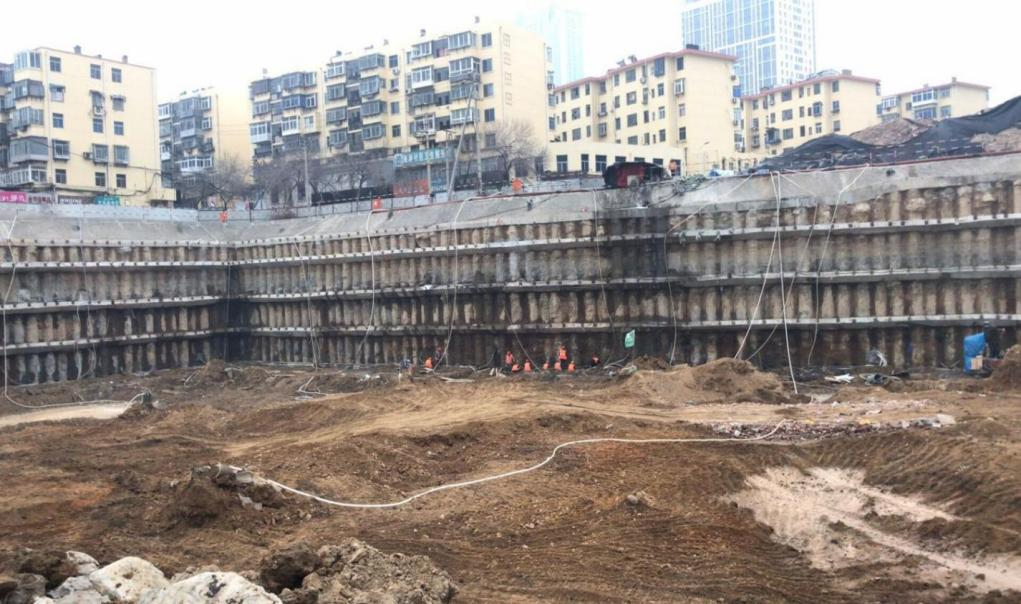 該項(xiàng)目總建筑面積約20萬平方米,濟(jì)南標(biāo)志性建筑,由主樓和裙樓組成,主樓地下3層,地上63層,高300米,因有軍用光纜需保護(hù),地下分為兩部分,自負(fù)二層采用地下通道相連。該項(xiàng)目地質(zhì)條件及周邊環(huán)境復(fù)雜,基坑深度12.8m,支護(hù)設(shè)計(jì)難度大,特別是通道頂部有軍用光纜通過,不得挪移和破壞。地下通道采用了管幕頂托+內(nèi)支撐的支護(hù)方式,為濟(jì)南市首次采用;裙樓基坑采用了樁+內(nèi)支撐及樁錨支護(hù);降止水采用管井降水+支護(hù)樁樁間高壓旋噴截水帷幕方式。經(jīng)過基坑開挖驗(yàn)證,各項(xiàng)監(jiān)測數(shù)據(jù)正常,基坑位移及周邊建筑物沉降變形均滿足規(guī)范要求,沒有對(duì)周邊環(huán)境(尤其是保泉)產(chǎn)生不良影響,取得了良好的經(jīng)濟(jì)和社會(huì)效益。