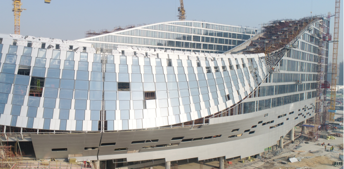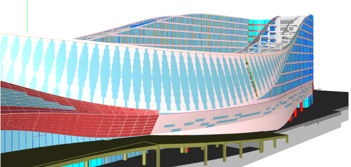 建筑設(shè)計為異形絲綢流線造型,結(jié)構(gòu)輔以大跨度鋼構(gòu)。因流線型造型給主體輪廓提出了更精準(zhǔn)的要求,利用BIM技術(shù)根據(jù)幕墻模型確定各功能分區(qū)各層樓板邊界輪廓、及相關(guān)交界面,確保項目的美觀。