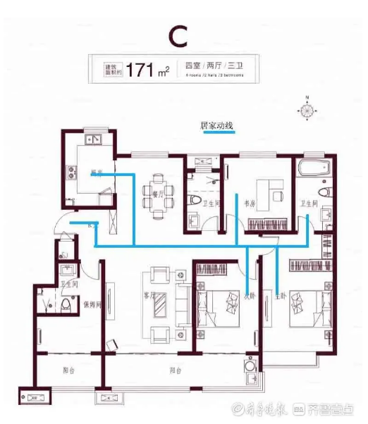 《后漢書·仲長(zhǎng)統(tǒng)傳》:“安居樂(lè)業(yè),長(zhǎng)養(yǎng)子孫,天下晏然。”往小了說(shuō),一個(gè)家庭有一個(gè)安定的居所,是子孫后代安心工作和生活的保障;往大了說(shuō),一個(gè)國(guó)家的公民能居有定所,老有所依,是整個(gè)國(guó)家安定發(fā)展的基礎(chǔ)。坊間一直流傳著一句笑話就是“丈母娘推動(dòng)了中國(guó)房地產(chǎn)行業(yè)的飛速發(fā)展”,雖然是玩笑話但也多少反映了房子承載著中國(guó)人血脈里的歸屬感。世俗的中國(guó)人都避不開的問(wèn)題就是買房,而買房動(dòng)輒幾百萬(wàn)的支出也確實(shí)是一個(gè)家庭非常重大的決策了,一定要謹(jǐn)慎再謹(jǐn)慎,仔細(xì)挑選各方面都心儀的房子。作為九零后代表,我跟大家談?wù)勎倚哪恐械暮梅孔印:芏嗯笥言谫I房的時(shí)候比較關(guān)心的就是價(jià)格、地段、戶型、樓層、環(huán)境等,一間舒適的房子,干凈整潔的室外環(huán)境、貼心周到的物業(yè)服務(wù)、低密度的空間是錦上添花,實(shí)際居住起來(lái)最要緊的還是戶型,而戶型最重要的則是動(dòng)線。一所好房子不在于戶型多么大,裝修多豪華,零零碎碎的日子過(guò)起來(lái),舒服才是最重要的。而戶型動(dòng)線影響著人的日常生活起居、大小事情,如果動(dòng)線不合理,就造成住戶日常生活行動(dòng)在各個(gè)功能區(qū)間交叉行走,影響其他家庭成員的活動(dòng),還造成了空間的浪費(fèi),以現(xiàn)在的房?jī)r(jià)浪費(fèi)一平米那損失的直接就萬(wàn)元起了。可能好多朋友并不明白或者并沒有注意過(guò)戶型動(dòng)線是什么。所謂戶型動(dòng)線,是指根據(jù)住宅結(jié)構(gòu)分布而成的主要活動(dòng)路線。不同的區(qū)域有不同的動(dòng)線設(shè)計(jì)方式,主要包括居住動(dòng)線、家務(wù)動(dòng)線和訪客動(dòng)線,不同的動(dòng)線功能也不同。我以四建一個(gè)項(xiàng)目的戶型給大家做如下講解。
