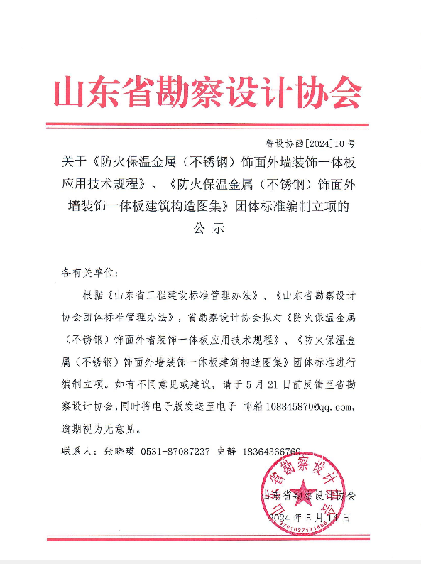 附件:關(guān)于《防火保溫金屬(不銹鋼)飾面外墻裝飾一體板應(yīng)用技術(shù)規(guī)程》、《防火保溫金屬(不銹鋼)飾面外墻裝飾一體板建筑構(gòu)造圖集》團(tuán)體標(biāo)準(zhǔn)編制立項(xiàng)的 公 示
